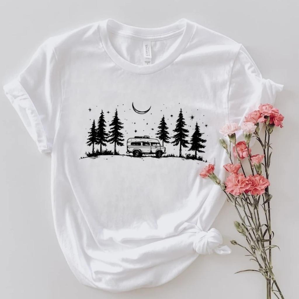 Camping Van Graphic Lady T-Shirt Cute Short Sleeved O-Neck Top Fashionable Printed T-Shirt Female Summer Trendy Casual T-Shirt