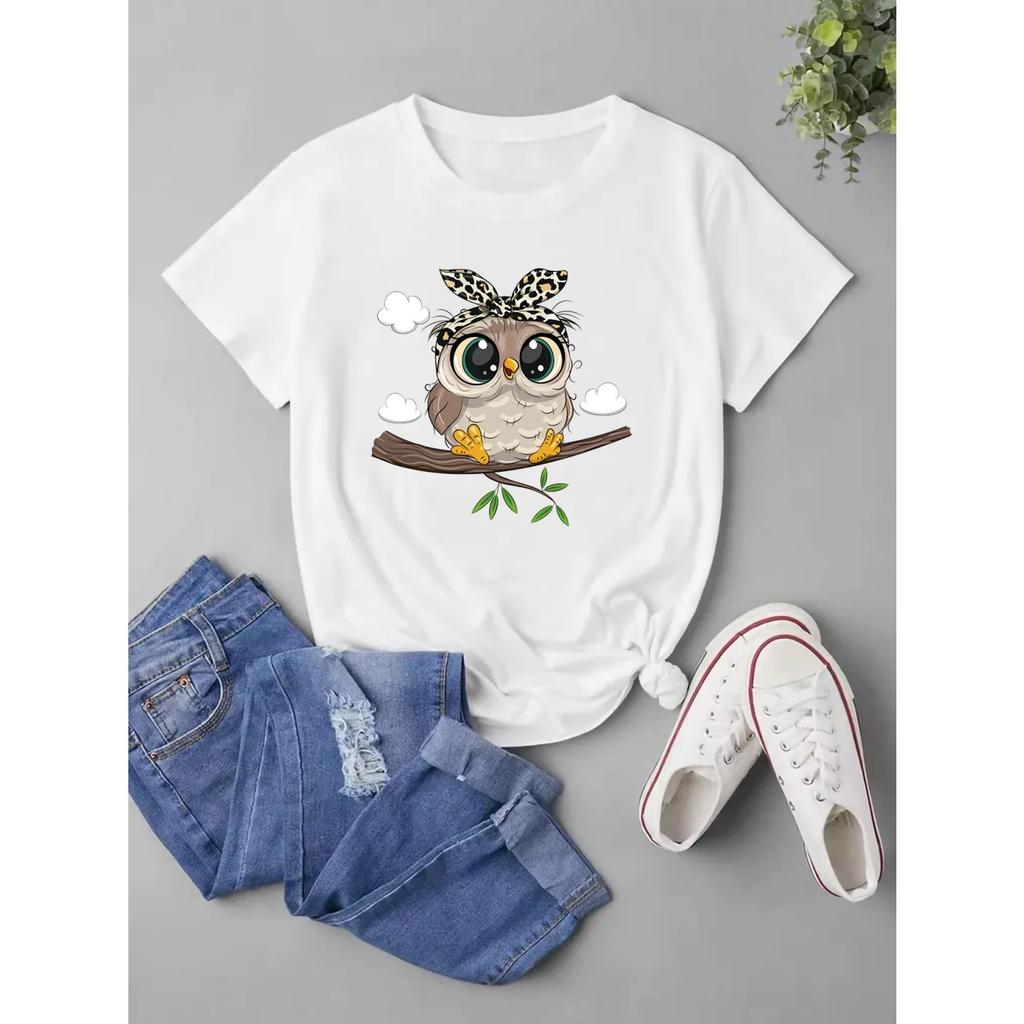 Cartoon Kawaii Owl Print T-Shirt, Short Sleeve Crew Neck Casual Top For Summer & Spring, Women's Clothing