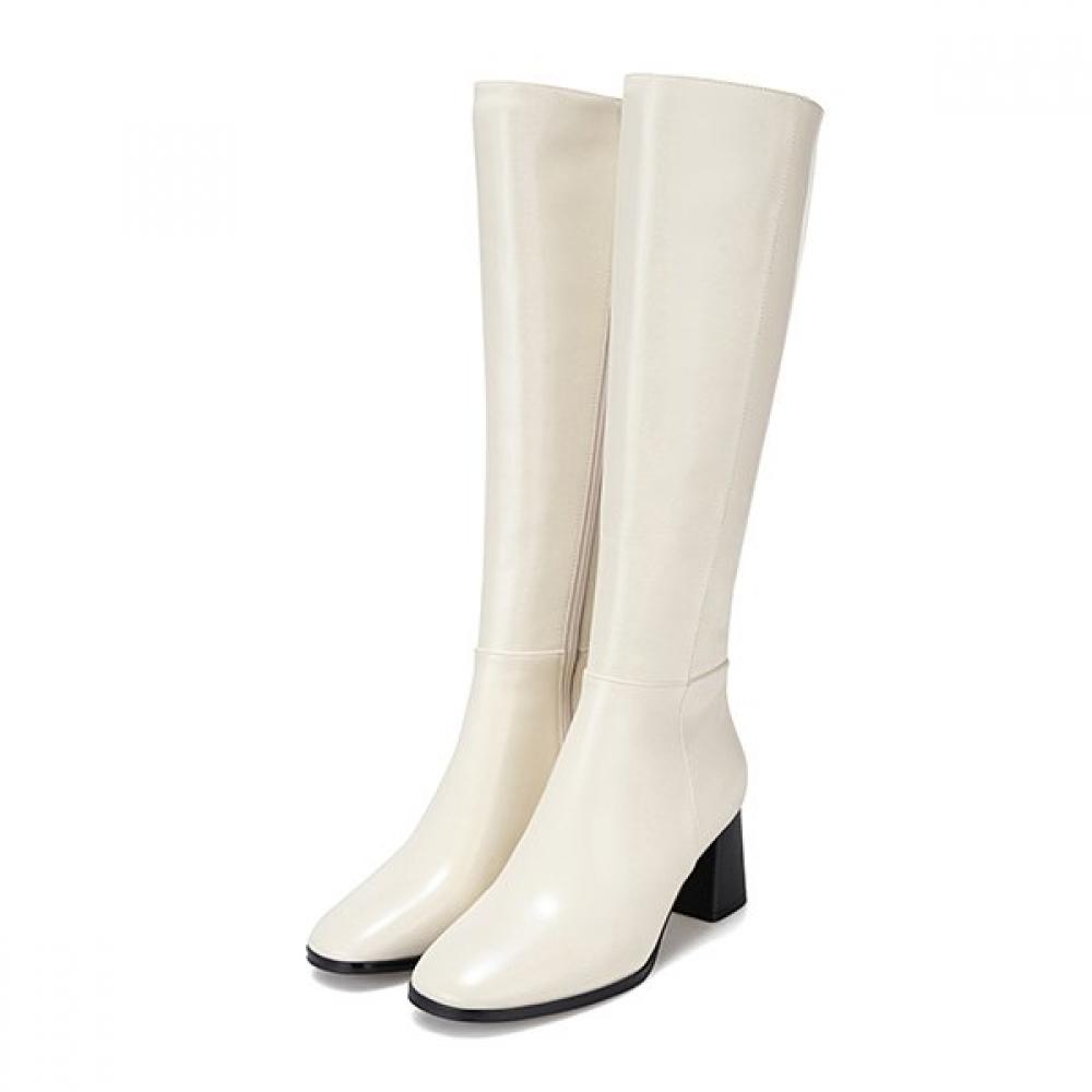 The BABARA Cow Leather Breathable Long Boots feature a 6.5cm heel height for stability while walking and a soft ivory color that matches various styles. Its long-boot style reaches below the knee and is made of breathable materials, offering comfort with an easy-on, easy-off structure that is suitable for daily wear.