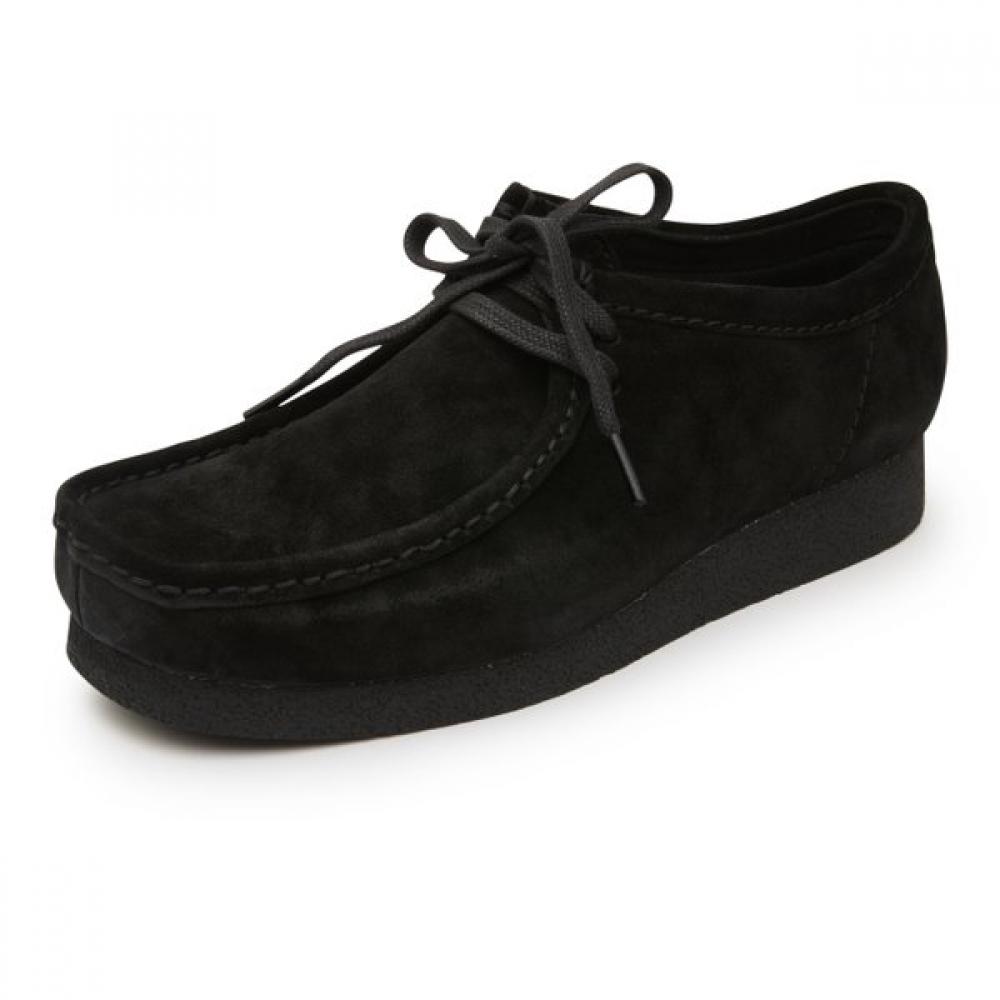The Clarks Men's Waterproof Suede Wallabee is made of waterproof treated suede material, making it strong against water and suitable for everyday humid environments. The plain toe design has no embellishments, and the classic loafer/slip-on style provides a comfortable fit. Available colors include black and green.