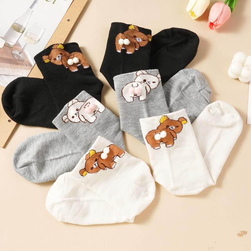 Black White Gray Bear Ankle Socks Cartoon Cute Breathable Sweat-Absorbent Low-Cut Socks for Women