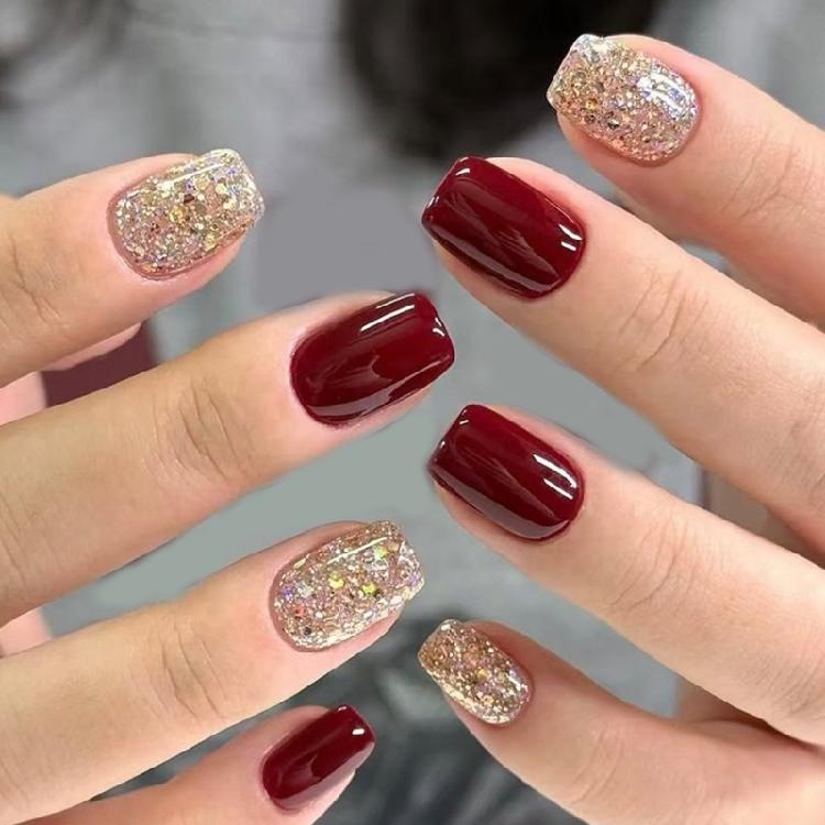 24pcs Glossy Red Glitters Press On Nail Short Square Styles Durability Fake Nail For Christmas And New Year Party