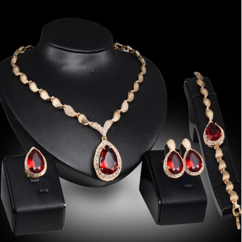 C222 Simple Wedding Banquet Alloy Rhinestone Jewelry Necklace Earrings Ring Bracelet Four-Piece Set Hot Sale