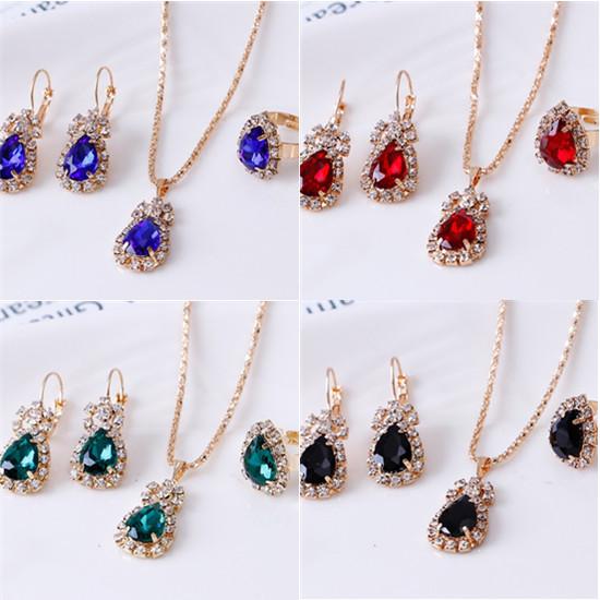 C190 Personality Water Drop Rhinestone Necklace Earrings Ring Set Bridal Jewelry Three-Piece Set