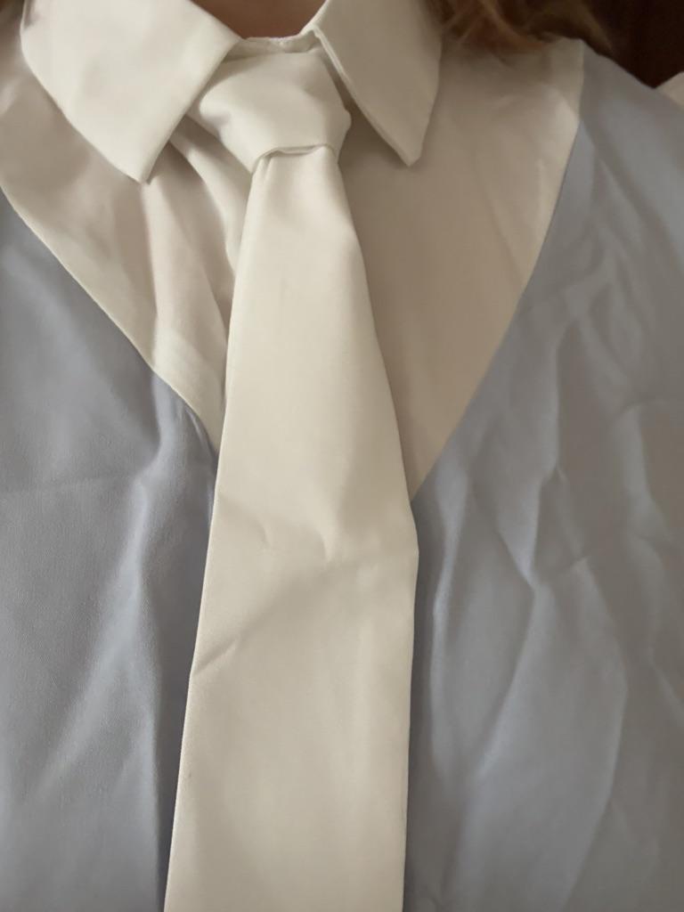 The dress is cut but very pretty, the color is grey-blue, and you will have to tie the tie yourself.