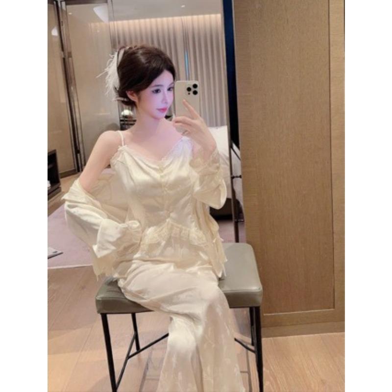 New Ice Silk Pajamas for Women with Chest Pads, National Style Jacquard Suspenders, Three-piece Set of Pure Desire Silk Loungewear