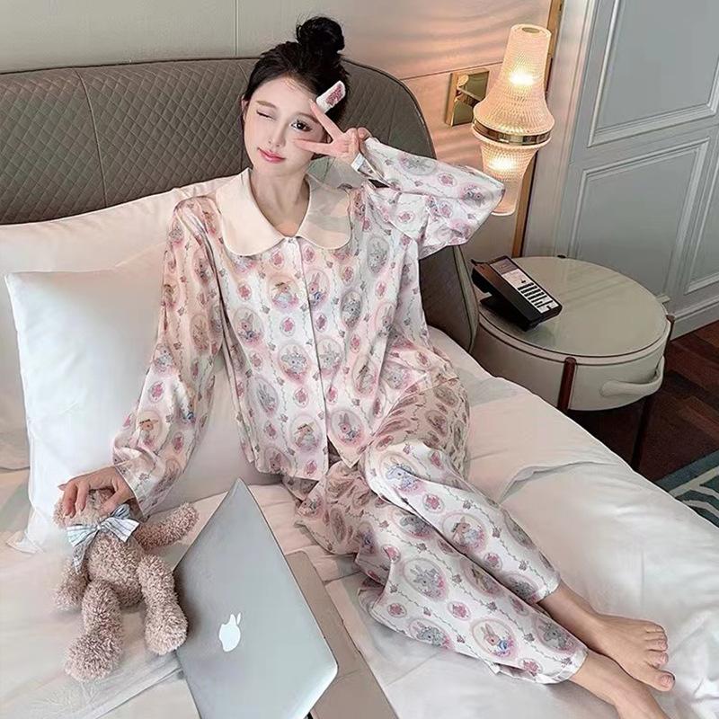 Pajamas Women's Ice Silk Pastoral Rabbit Ice Silk Long Sleeves Trousers Printed Silk Doll Collar Sweet Loungewear Can Be Worn Outside