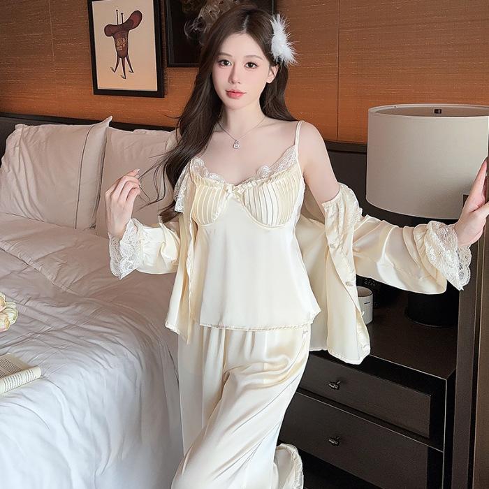Sexy Pajamas Women's Spring and Autumn Ice Silk French Style with Chest Pad Suspenders Three-piece Set of Pure Desire Silk Loungewear Can Be Worn Outs