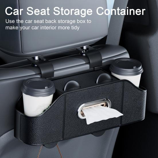 Car seat back storage box with 2 cup holders offers a durable and practical solution to keep your car interior organized. Made from high-quality plastic with fine workmanship, this multifunctional organizer features a partition design that securely holds paper towels, water cups, keys, cell phones, and more.