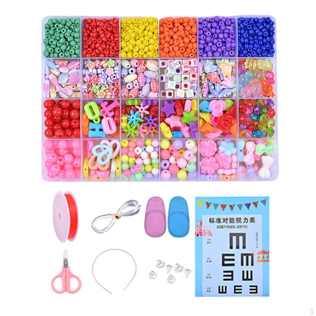 - INCLUDE 1 Box of Colorful beads, 1x standard eye chart, 1x scissors, 1x headband, 4x headband covers, 10m red elastic thread, 5m clear elastic thread, and 2x eye mask .