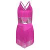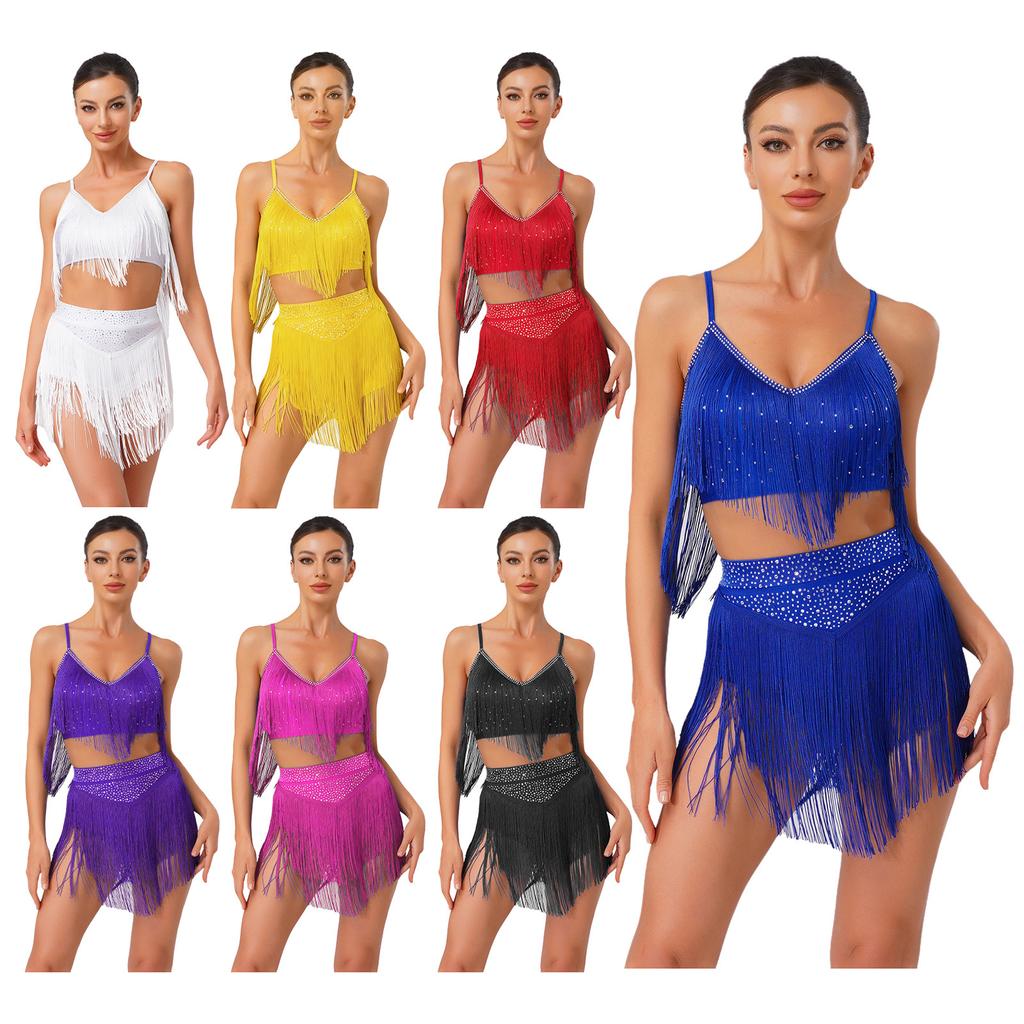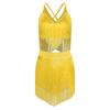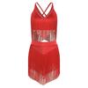 Womens Salsa Latin Dance Performance Costume V Neck Sleeveless Crisscross Back Fringe Crop Top Tiered Tassels Skirt