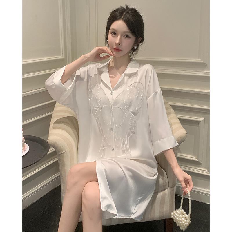 [Crystal Butterfly] French Elegant Wind Shirt Skirt Spring Summer Ice Silk Nightdress Women's Thin Cool Homewear