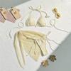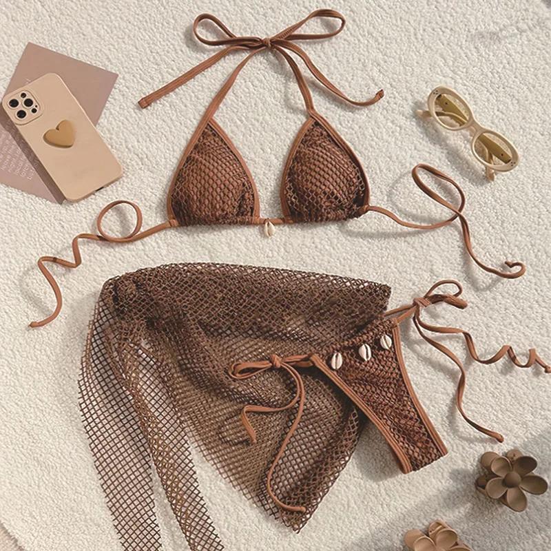 Sexy Brown Mesh Swimsuit Cover Ups Women Triangle String Micro Bikini Thong Halter Swimwear Bathing Suit 3 Piece Bikini Set 2025