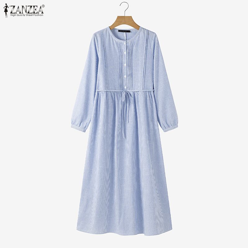 ZANZEA Women Casual Round Neck Loose Long Sleeve Stripe Dress
