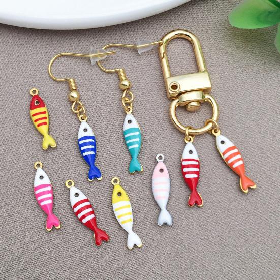 Introducing our fish charms, crafted from high-quality stainless steel for durability and long-lasting color. Each set includes 20 small fish accessories, with each fish measuring 5*19mm. The double-sided enamel striped fish design is vibrant and fashionable, perfect for adding a coastal touch to your jewelry creations.