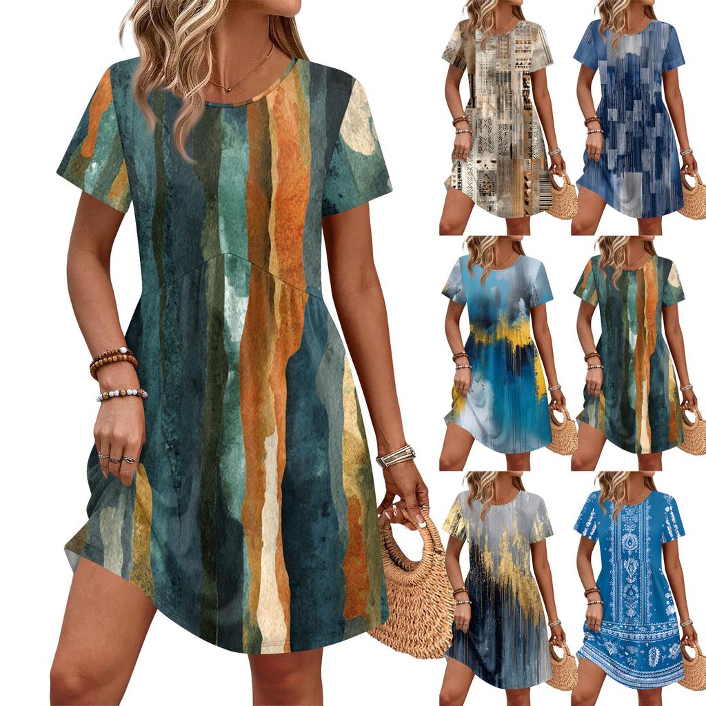 Dresses For Women Short Sleeve Print Round Neck Casual Dresses Waist Dress With Pockets