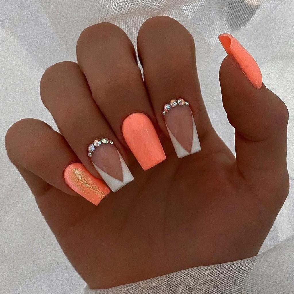 Orange & White French Rhinestone Color-Changing Dragon Glitter Nail Stickers - Finished False Nails