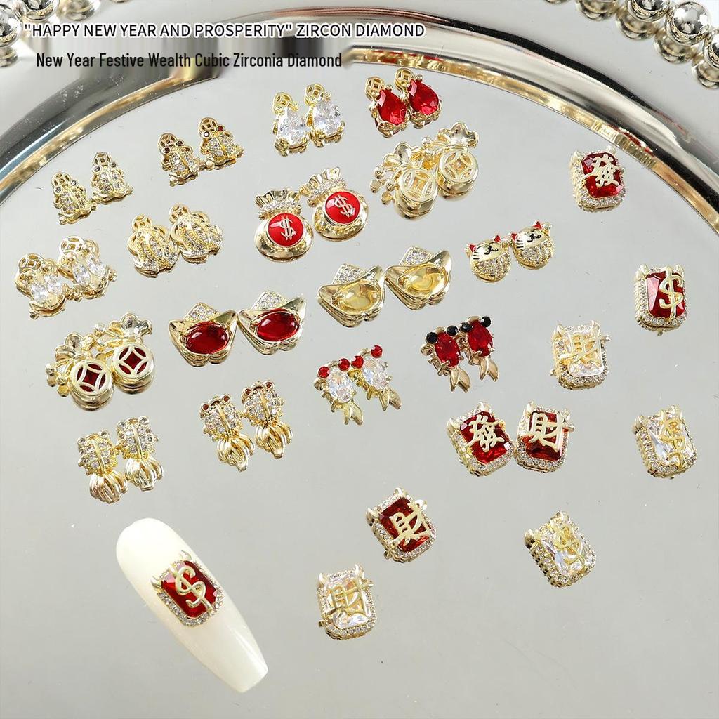 Festive Chinese Style Manicure: Lucky Bag Zirconia Ornaments with Golden Toad, Yuanbao, and Money Character Press-on Nails