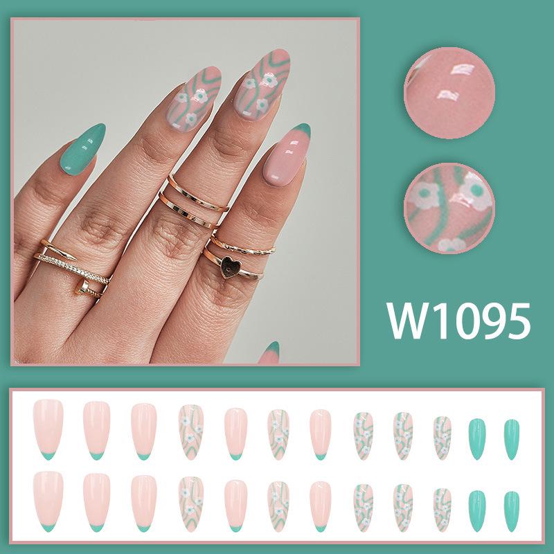 Summer Fresh Light Green Floral French Girly Almond Nail Art Tips