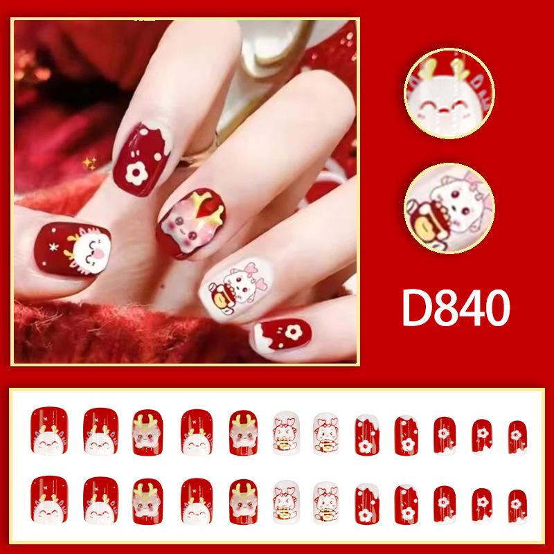 Festive Red Cartoon Dragon Nail Tips - Short Style Floral Design for Students