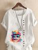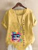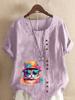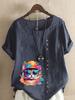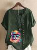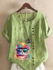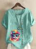 Women's Fashion Colorful Cat Print Round Neck Short Sleeve T-shirt Summer Casual Cotton Linen Graphic Shirt Leisure Loose Blouse Tops
