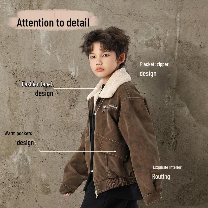 This stylish leather jacket is designed to keep boys warm and fashionable during the winter months. Featuring a thick lapel and motorcycle style, it boasts a luxurious fur collar that adds extra warmth and a touch of sophistication. The jacket is crafted from high-quality faux leather material and is fully lined with fleece for maximum comfort and insulation. With long sleeves for added coverage, this jacket is the perfect blend of durability and style for any young adventurer.