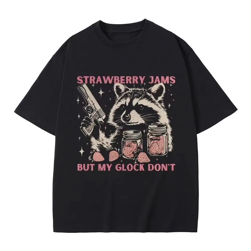 Strawberry Jams But My Glock Dont Funny Raccoon Meme Tshirts Women Casual Vintage Short Sleeve Streetwear Novelty T Shirts