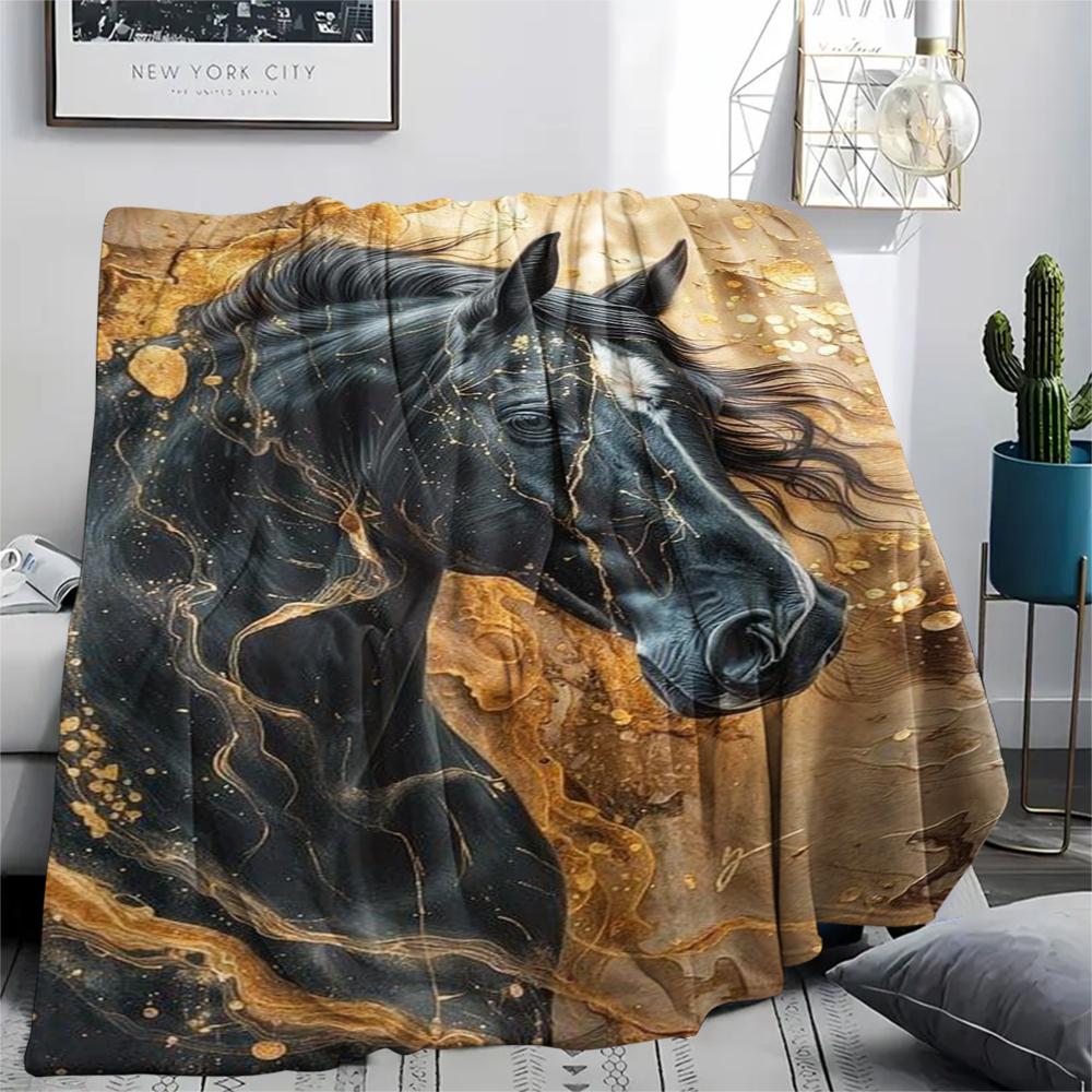 1Pc Black Horse Print Flannel Blanket, High Quality Comfortable for All Seasons, Home Decor, Warmth and Comfort, Perfect for Gifts