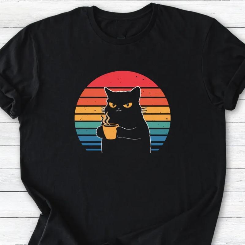Funny Black Cat TShirt Retro Sunset Coffee Design Womens Casual Short Sleeves Minimalist Cute Cat Shirt for Daily Wear