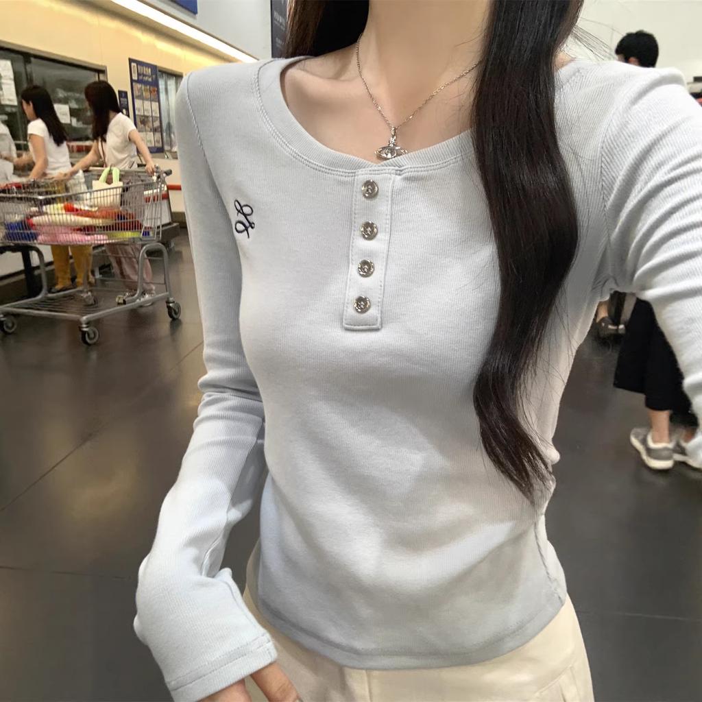 Soft Wind-blown Embroidered Button Long-sleeved T-shirt for Women In Early Autumn, New Style, Base Layer Top with Pleated Waist Design.