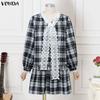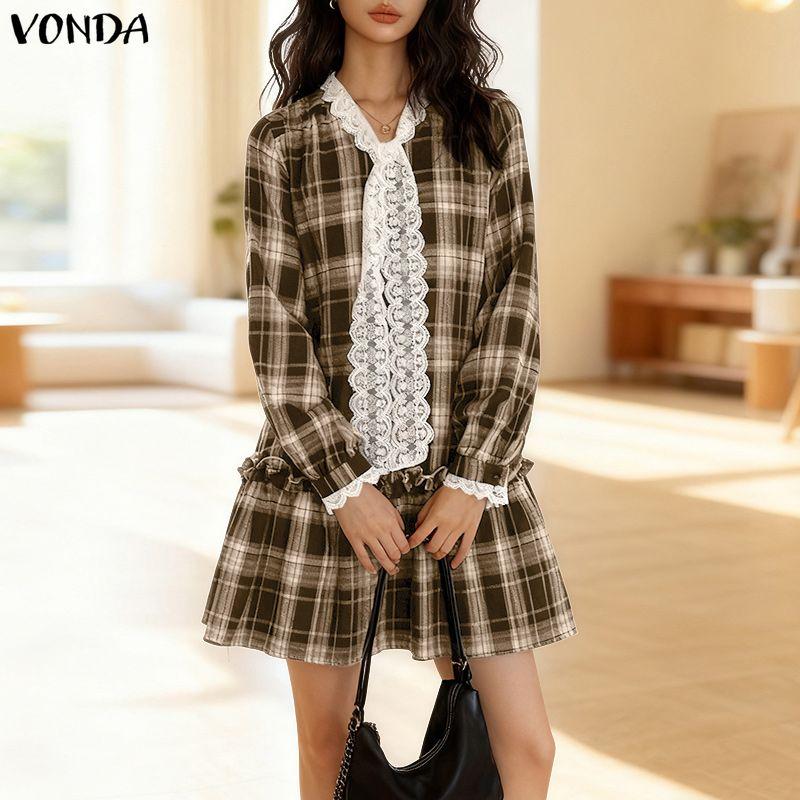 Features:V neck lace lace patchwork checkered pattern, black ear trim, lotus leaf hem, loose A style long sleeves short regular women's wear dress