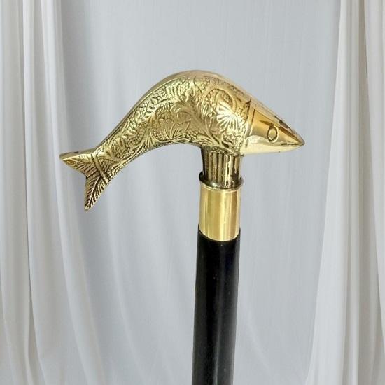 The handle is made from high-quality solid brass, carefully shaped into an elegant fish head motif that symbolizes strength, movement, and nautical heritage. The shaft is crafted from durable hardwood, polished for a smooth, comfortable grip and long-lasting use. The combination of brass and wood gives this cane a luxurious antique nautical look.