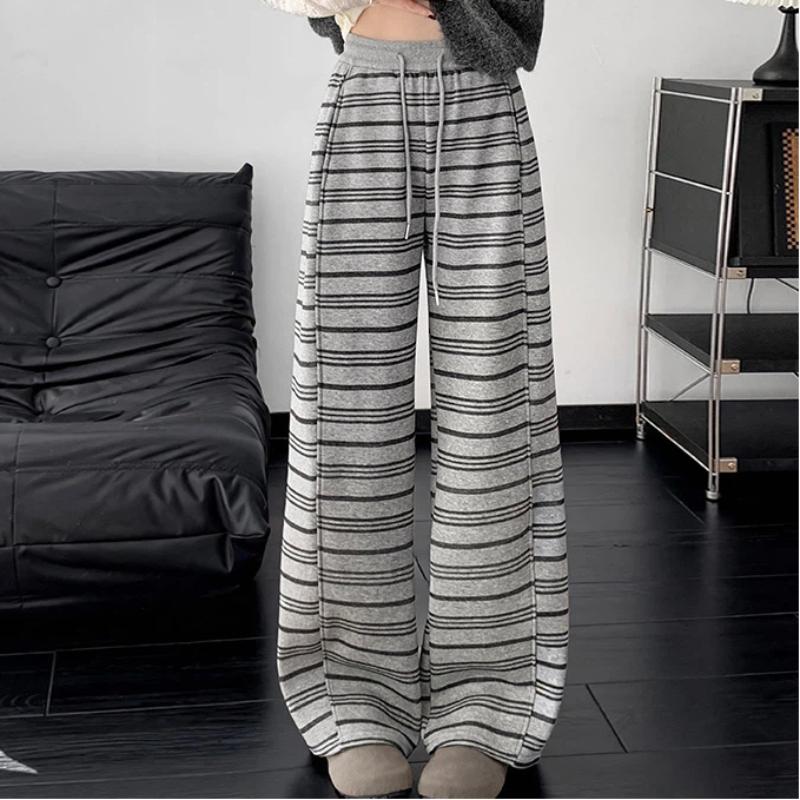 Women's Autumn Winter Fleece Lined Striped Curved Pants High Waist Slim Casual Straight Leg Floor-length Loose Wide-leg Trousers