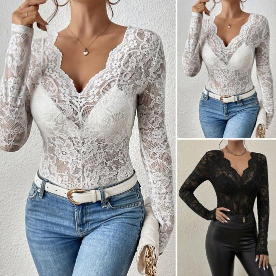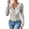 Women Tops V-Neck Long Sleeve Hollow Embroidery Lace Design Pullover Tops Pure Color Slim Fit Mesh Detail Blouse Daily Wear