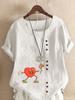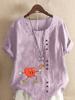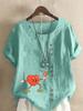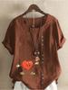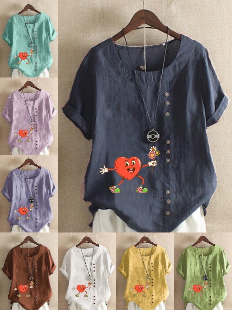 Women's Fashion Heart Shaped Floral Print Round Neck Short Sleeve T-shirt Summer Casual Cotton Linen Graphic Shirt Leisure Loose Blouse Tops