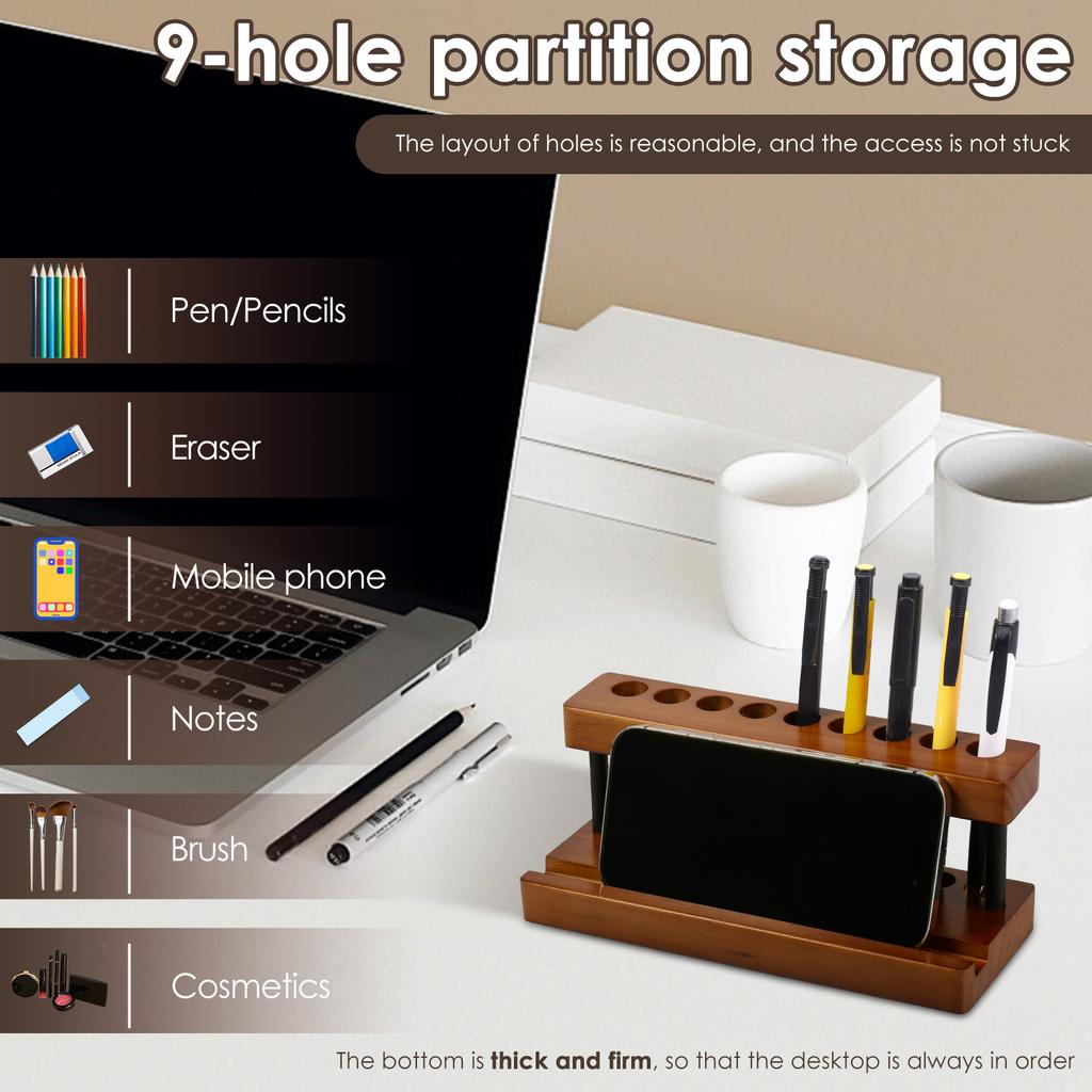 2Pcs Wooden Pen Holder with 9 Slots and Phone Holder Decorative Wood Pencil Organizer Pens Display Stand for Home Office Decor