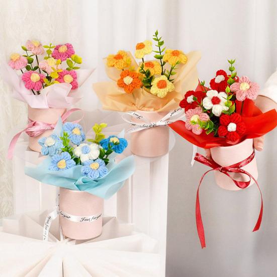 This hand-woven crochet bouquet features exquisitely crafted flowers made from high-quality wool, showcasing layered, lifelike petals that highlight the warmth and artistry of handmade design. Unlike real flowers, these environmentally friendly wool bouquets require no watering or maintenance, ensuring long-lasting freshness and beauty.