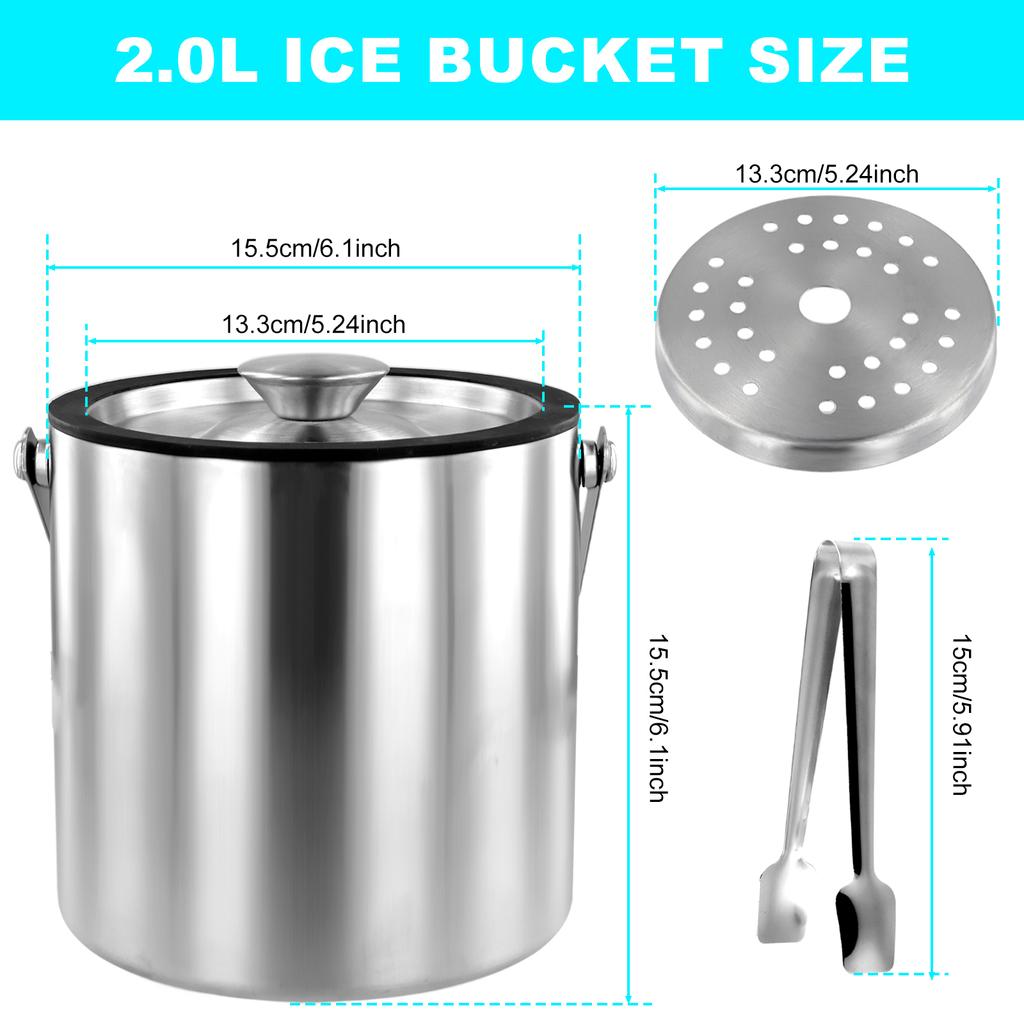 Insulated Ice Bucket with Silicone Lid, Tongs & Strainer, Double Wall Stainless Steel Ice Bucket for Parties and Bar Ice Bucket
