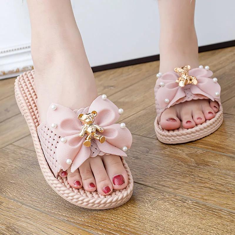 Women Fashion Sweet Light Weight Anti Skid Spring Peep Toe Pink Bow Tie Slippers Lady Classic Home Outside Slide Ab764