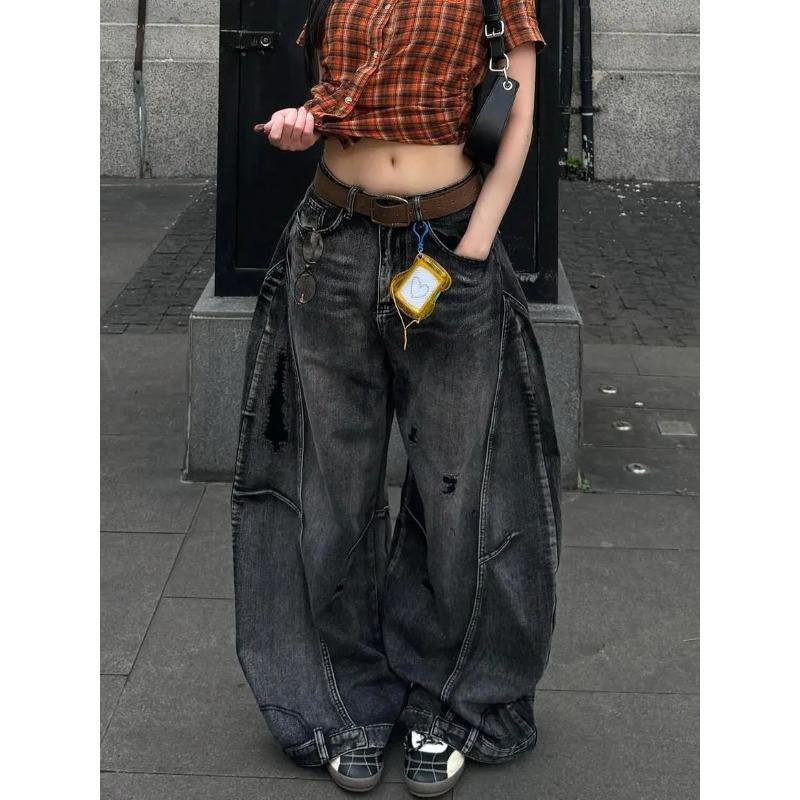 Retro Large Size Washed Frayed Scimitar Jeans Women's Street Loose Slimming Wide-legged Long Pants Trendy