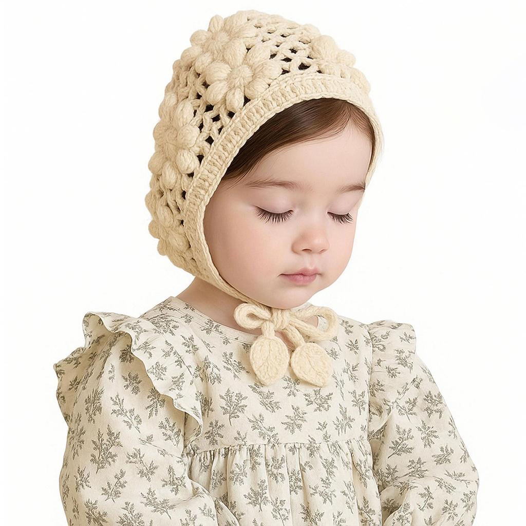 [Loose knitting and 3D flowers are the main focus] This knit bonnet instantly brightens up the face with its large, hand-knitted-look flower motif and openwork shading. The soft texture of the area that touches the skin is non-irritating, and the 3D effect is attractive and looks great in photos. The natural taste makes it easy to coordinate with outfits for home photos, studio shoots, half birthdays, first birthdays, and Shichi-Go-San photo shoots. The calm ivory and beige colors match a wide range of outfits, including dresses, rompers, and cardigans. The design is long-lasting, from everyday trips to the park to recitals and special occasions.