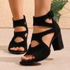 Summer Women's Black Suede Chunky Heel Sandals, Hollow Open-Toe High Heels, Fashionable Roman Style Versatile Women's Shoes for