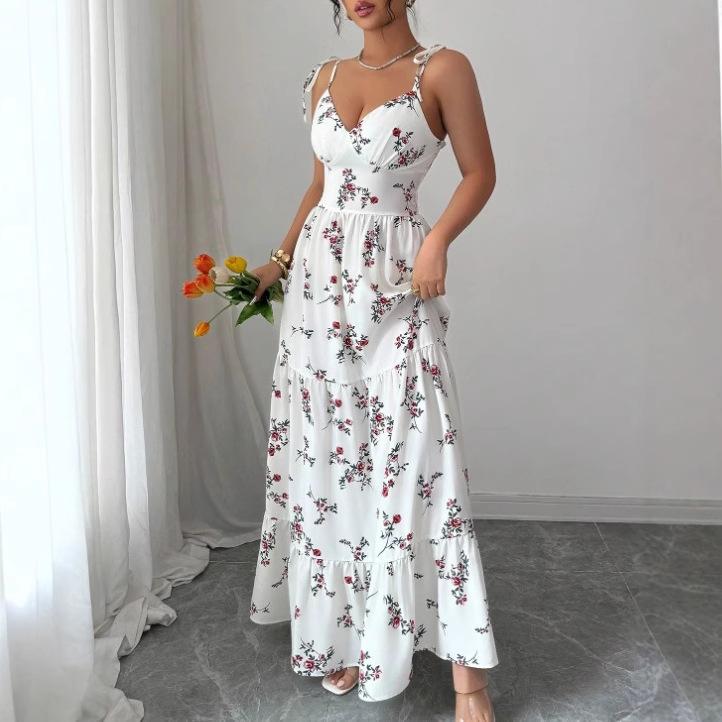 Summer New V-neck Slim-fitting and Thin Floral Long Skirt Printed Fairy Suspender Dress