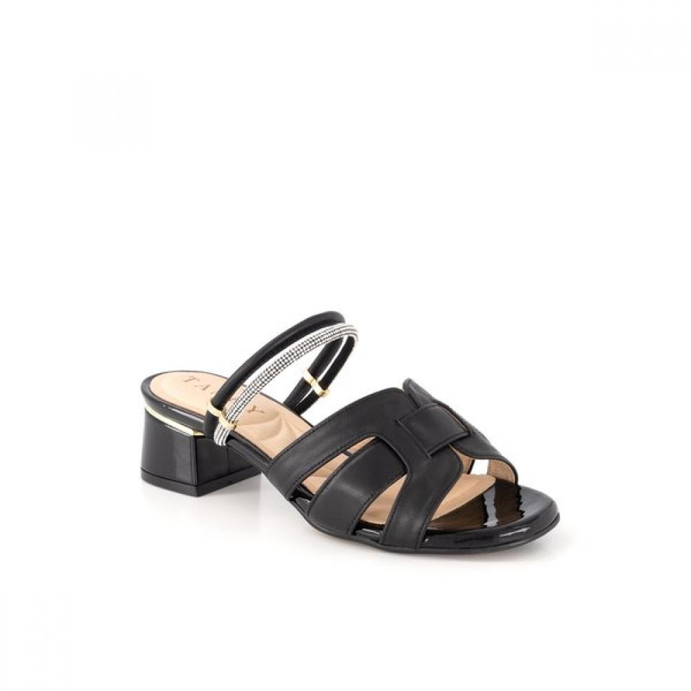 The Tandy Women's Sandal (722086, K-040) features a sleek design in black and is crafted to offer comfort with a heel height of 4CM for stable walking. The sandal pairs well with skinny lines, skirts, and pants alike. It is equipped with a non-slip outsole and employs high-frequency naisha technology to reduce foot fatigue. Made from cow leather known for its breathability and flexibility, it offers a lightweight feel perfect for the summer season.