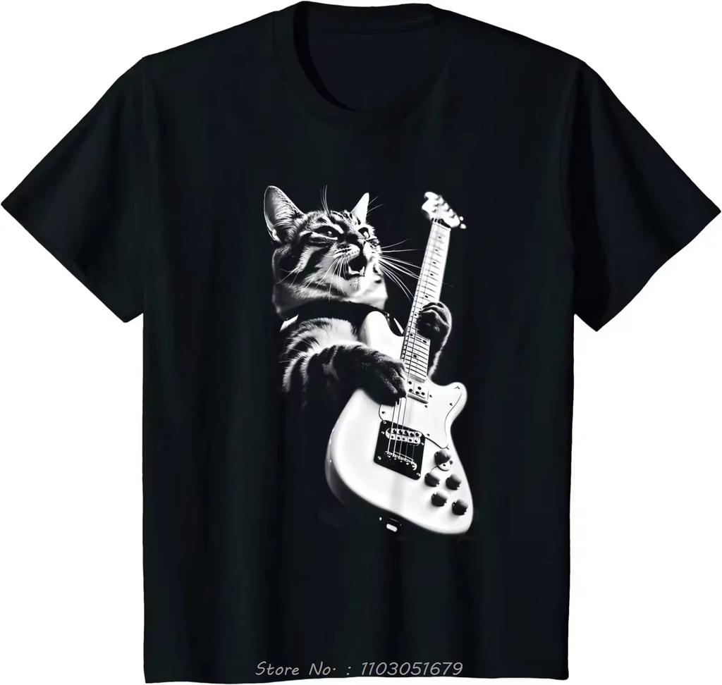 Rock Cat Playing Guitar Guitar Cat Mens Clothing Oversized T Shirt Casual Daily Fitness T Shirt Four Seasons Cotton Tshirt