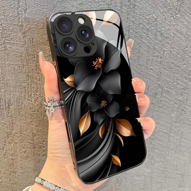Black Flower Golden Leaf Pattern Tempered Glass Phone Case For iPhone 17 16 15 14 13 12 11 Pro Max 17Air 16E 7 8 Plus XS X Cover