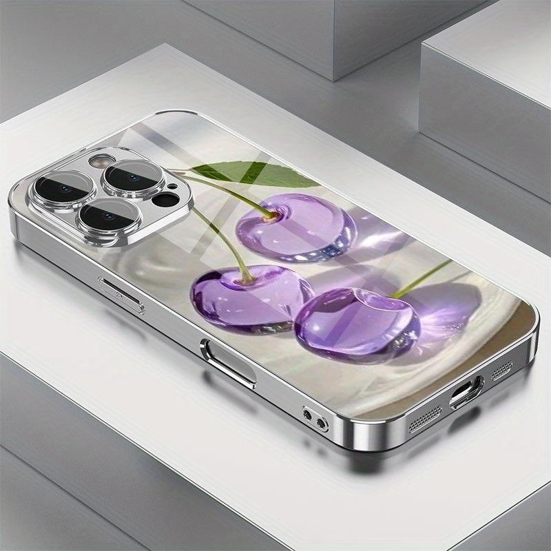Purple Crystal Cherry Pattern Tempered Glass Electroplated Silver Phone Case For Samsung Galaxy S25 S24 S23 Ultra Plus FE Cover