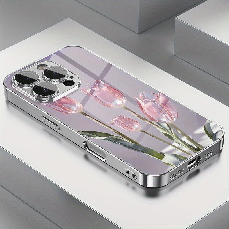 Pink Glass Tulip Pattern Tempered Glass Electroplated Silver Phone Case For Samsung Galaxy S25 S24 S23 Ultra Plus FE Cover