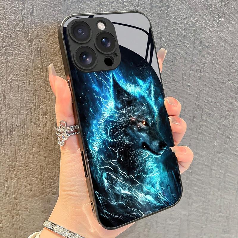 Gradient Blue Flame Wolf Pattern Tempered Glass Phone Case For iPhone 17 16 15 14 13 12 11 Pro Max 17Air 16E 7 Plus XR XS Cover