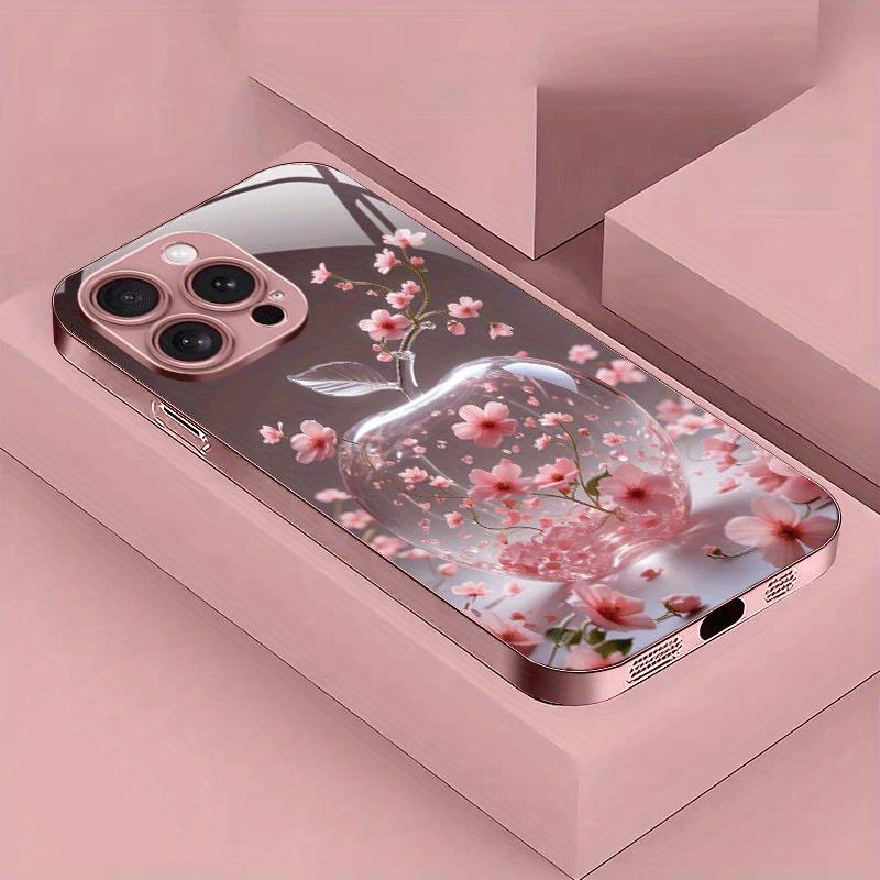 Cherry Blossom For Apple Pattern Pink Metal Paint Tempered Glass Case For iPhone 17 16 15 14 13 12 Pro Max Plus 16E 17Air Cover